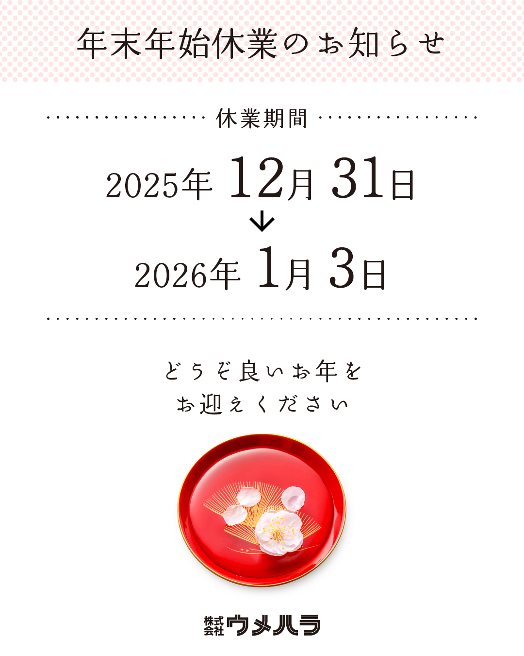 誠に勝手ながら、弊社の年末年始の休業は上記の通りとさせていただきます。